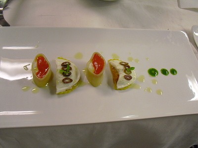 左から ドライトマトのラヴィオリ ジャガイモとやぎのチーズのファゴッティーノ 鹿のローストカシスのソース